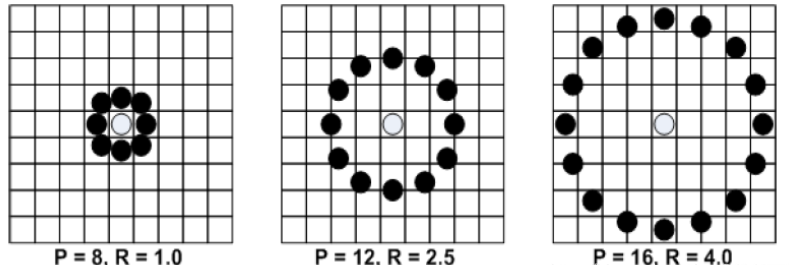 使用可变半径的圆对近邻像素进行编码,可得到如下近邻: